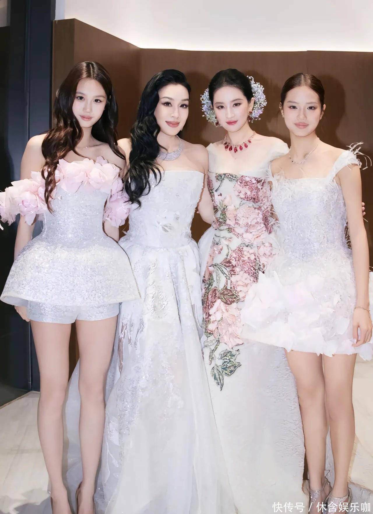 而比起三人的同框被惊叹,被盛赞的是刘亦菲的倾情加盟大合影。当晚,四个人的礼服色系甜美撞衫了哦,甜美优雅的银色系站在一起还真像是“一个团队”。据说刘亦菲一直是Jaden和考拉的超级女神,能和她在盛会上合影成了这对小姐妹最开心兴奋的环节。想一想还不到20岁的她们也是看着神仙姐姐的热播剧长大呢。
